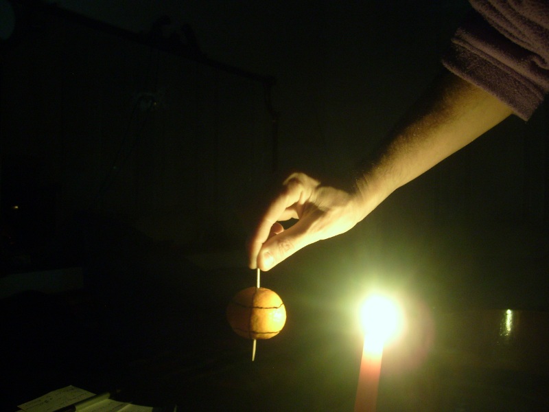 Prendiamo un’arancia, un mandarino, una pallina di plastilina, (meglio un’arancia) comunque qualcosa di sferico, facile da maneggiare, e …avete già capito: La fonte luminosa è il Sole e l’arancia è la Terra!